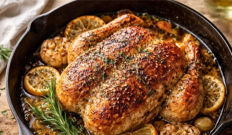 • Remove the pan from the oven and cover with foil. Let the chicken rest for ten minutes to lock in the juices. Garnish with fresh lemon slices before serving.