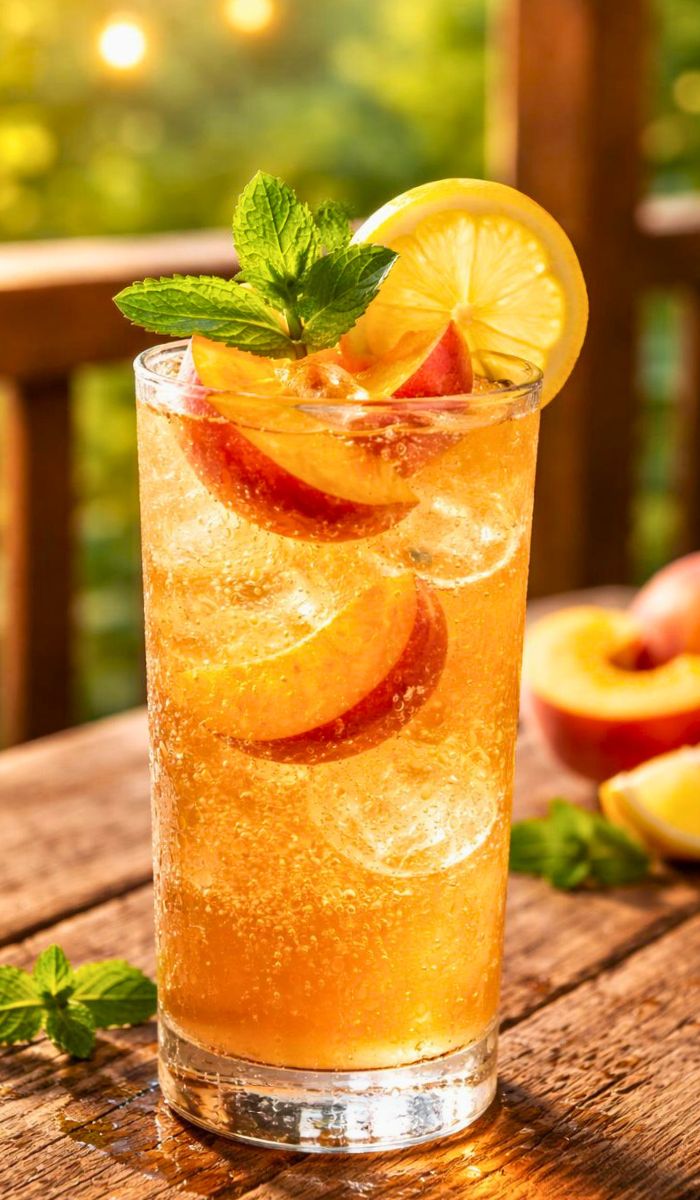 Grab highball glasses. Fill with ice. Pour the mix over. Garnish with peach slices, mint, and lemon wheels. Sip right away. Enjoy your homemade Texas Roadhouse Porch Rocker!