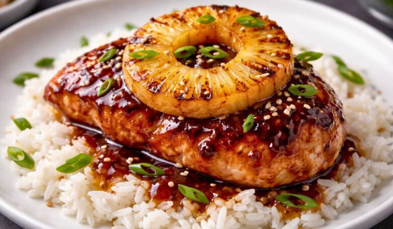 • Place a grilled pineapple ring on top of each chicken breast. Drizzle more of the thick glaze over everything. Sprinkle with green onions and sesame seeds. Serve it while it is hot and fresh.